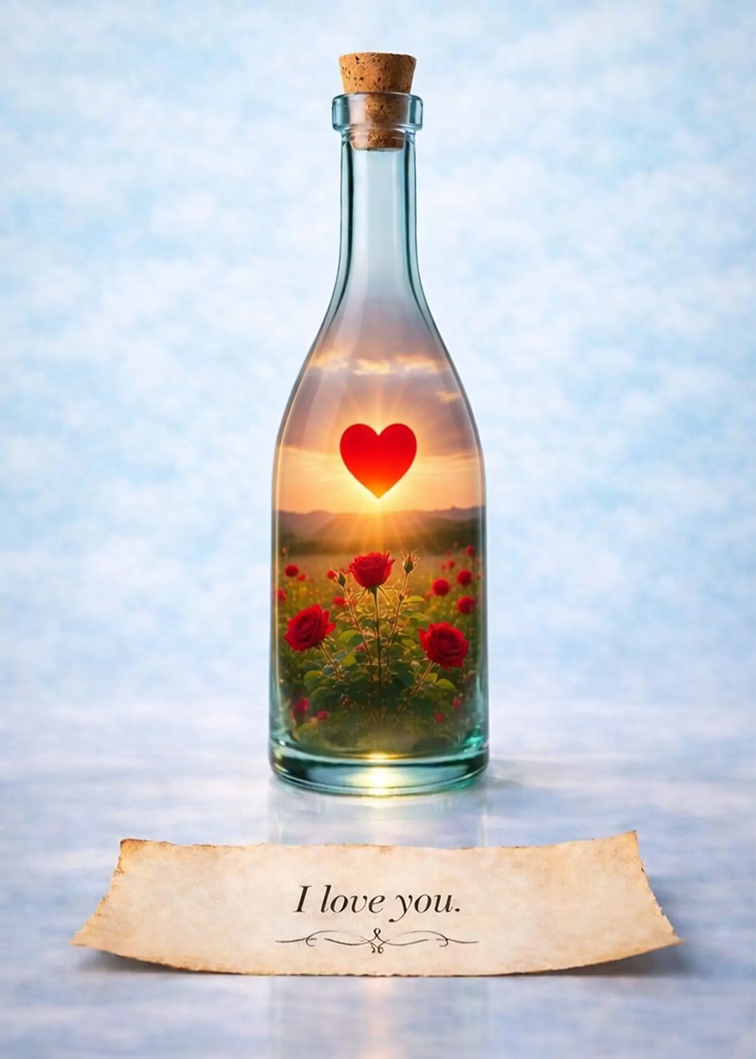 A beautifully printed bottle scene designed to hold a meaningful message — love made tangible, made permanent. Presented in a clear sleeve with red envelope, display stand, and magnets. $19.99.