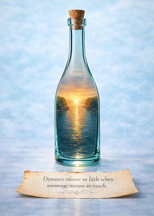 A beautifully printed bottle scene designed to hold a meaningful message — something to bridge the distance. Presented in a clear sleeve with red envelope, display stand, and magnets. $19.99.