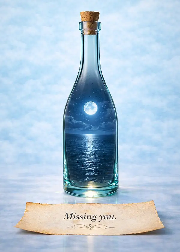 A beautifully printed bottle scene designed to hold a meaningful message — something to carry across the distance. Presented in a clear sleeve with red envelope, display stand, and magnets. $19.99.